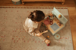 Køkkenet kombinerer flere funktioner i ét: bordkøkken, komfur, grill, vask og ovn. Denne alsidighed gør det muligt at skabe mange forskellige legescenarier, hvor børn kan eksperimentere med madlavning og servering.